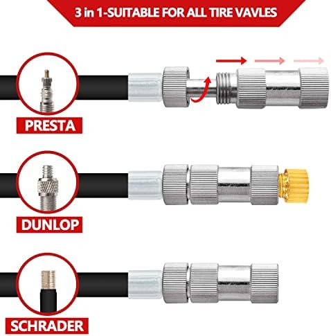[COMPATTIBILITÉ] Comme notre pompe a main est équipée avec 3 configurations de vannes, notre tuyau à une tête permet de rapidement changer de valves Presta et Schrader et Dunlop. De même, le raccord de soupape sécurisé avec filetage métallique assure une étanchéité optimale.Accesoire velo dure deux fois plus longtemps que les soupapes classiques.