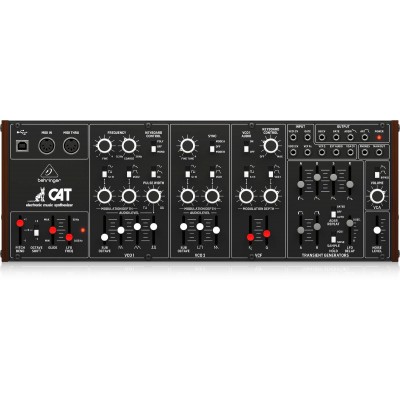 BEHRINGER CATSynthétiseur analogique paraphonique légendaire avec double VCO, 4 formes d’onde mixables, processeur de signal externe, polychaîne de 16 voix et format Eurorack.Cet étonnant synthétiseur analogique à double VCO permet de créer de la musique incroyablement riche. Reproduction authentique du circuit original « CAT SRM II » avec transistors et JFETs appariés.Chemin du signal purement analogique basé sur des conceptions authentiques de VCO, VCF et VCA.Caractéristiques-4 formes d’oscillateur variables et simultanées (Sawtooth, Triangle, Pulse modulée et Sub-Octave Square) pour des sons ultimes-Le mode Duophonic/Paraphonic permet de contrôler indépendamment les deux oscillateurs.-Les oscillateurs peuvent être modulés à partir de 6 sources différentes avec 2 atténuateurs de profondeur de modulation-Conception classique de filtre (passe-bas avec pic/résonance) avec capacité d’auto-résonance.-Le filtre peut être modulé à partir de 6 sources différentes avec 2 atténuateurs de profondeur de modulation.-LFO dédié et entièrement analogique à onde sinusoïdale/carrée.-2 générateurs d’enveloppes analogiques pour la modulation de VCF et VCA-Générateur de bruit blanc élargissant considérablement la génération de formes d’onde-Poly Chain 16 voix permet de combiner plusieurs synthétiseurs pour une polyphonie allant jusqu’à 16 voix.-Solution Eurorack complète ; le module principal peut être transféré dans un boîtier Eurorack standard.-47 commandes vous donnent un accès direct et en temps réel à tous les paramètres importants-Entrée audio permettant de traiter des sources sonores externes pour une créativité accrue-Entrées et sorties de contrôle externe (High Note CV, Low Note CV, Gate, Filter etc.)-Implémentation USB/MIDI complète avec sélection du canal MIDI et de la priorité des voix.-Sortie Main Output mini Jack 3,5 mm et 2 x Jack 6,3 mm (High et Low)-Sortie casque mini Jack 3,5 mm-Dimensions: 87 x 374 x 136 mm-Bloc d’alimentation inclus