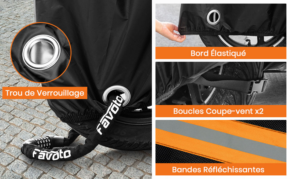 Bon matériel – La housse est faite de tissu polyester 210T pour protéger contre la pluie, la poussière, la chaleur, le soleil et les rayures et les intempéries. Résistant aux déjections d’oiseaux. Conception Antivol – Cette housse de motocyclette sécurisée est munie d’un trou de serrure qui facilite l’utilisation du verrou de la moto lorsque vous le fixez avec une serrure.