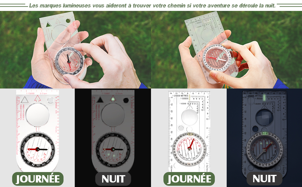 Conception lumineuse: conçue avec des marques lumineuses, la flèche de direction de déplacement, la ligne d’index et l’aiguille magnétique (N) de la boussole de l’explorateur vous rendent plus pratique à appliquer même la nuit ou sous la lumière sombre, vous fournissant des conseils en temps opportun