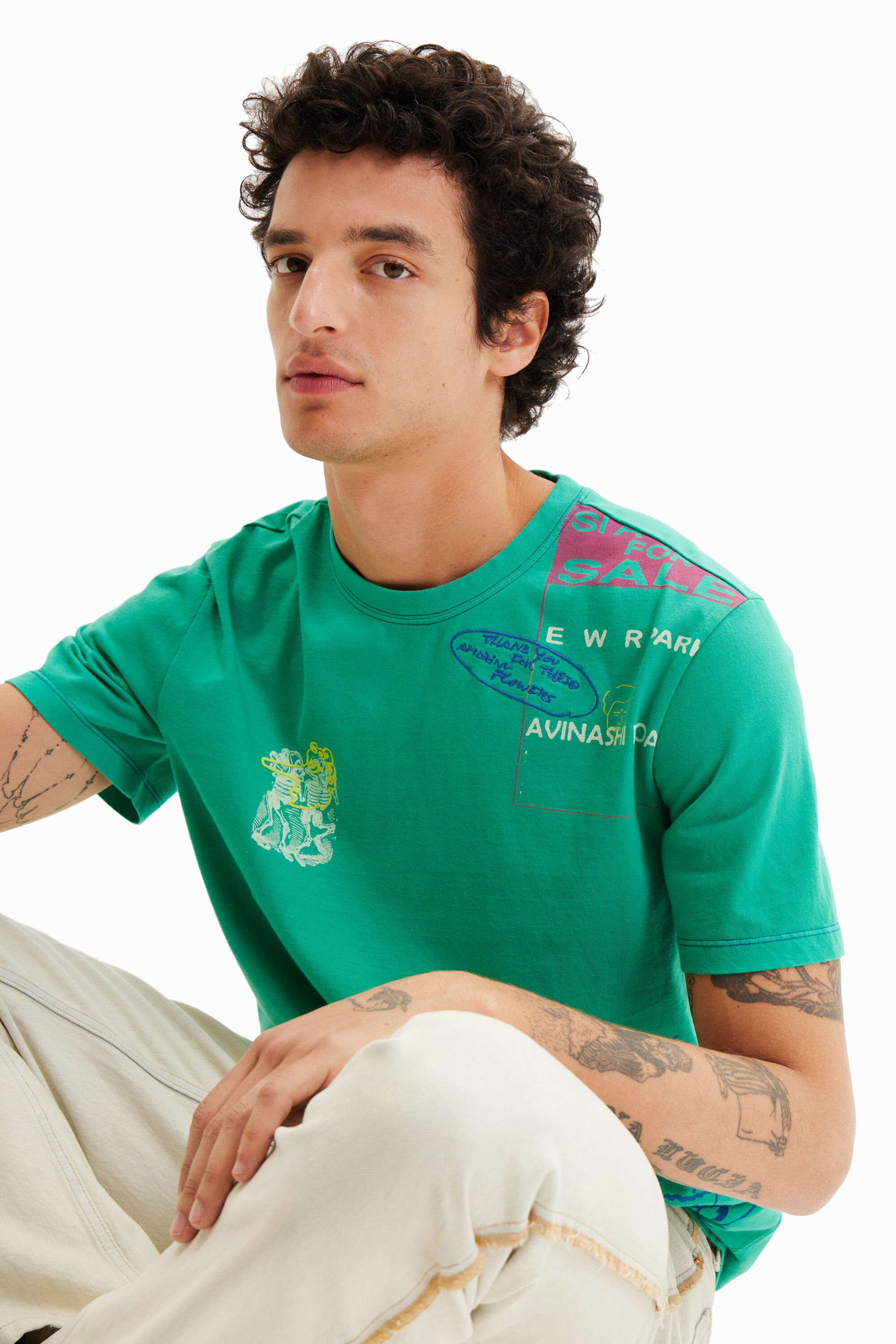 T-shirt à manches courtes, agrémenté d’illustrations, de messages imprimés et de détails brodés.